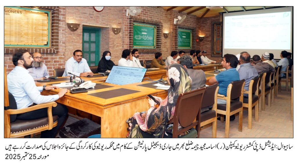 اجلاس میں پلس پروگرام کے تحت ضلع ساہیوال میں ڈیجیٹل پارٹیشن کے کام پر تفصیلی بریفنگ دی گئی جس میں اب تک کی پیش رفت، درپیش چیلنجز اور آئندہ کے اہداف پر تفصیل سے روشنی ڈالی گئی تاکہ اس عمل کو مزید بہتر بنایا جا سکے۔ کیپٹن (ر) اسامہ مجید چیمہ نے ہدایت کی کہ تمام ریونیو افسران مقررہ وقت میں اپنے اہداف کو مکمل کریں اور عوام کو اراضی کی تقسیم اور دیگر ریونیو خدمات میں کسی قسم کی تاخیر نہ ہونے دیں۔